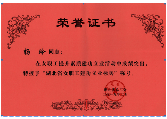 近日,湖北省总工会为贯彻落实新发展理念和高质量发展要求,深入推进女职工提升素质建功立业工程,表彰了 10 个集体“湖北五一巾帼奖”,授予“湖北工人先锋号”称号; 10 名“湖北五一巾帼奖”,授予“湖北五一劳动奖章”称号;50个女职工集体“湖北省女职工建功立业标兵岗”称号、 50 名女职工“湖北省女职工建功立业标兵”称号;100 个女职工组织“湖北省先进女职工组织”称号、100 名女职工工作者“湖北省优秀女职工工作者”称号。湖北五环会计师事务有限公司注册会计师杨玲同志在女职工提升素质建功立业活动中成绩突出,授予“湖北省女职工建功立业标兵”光荣称号。